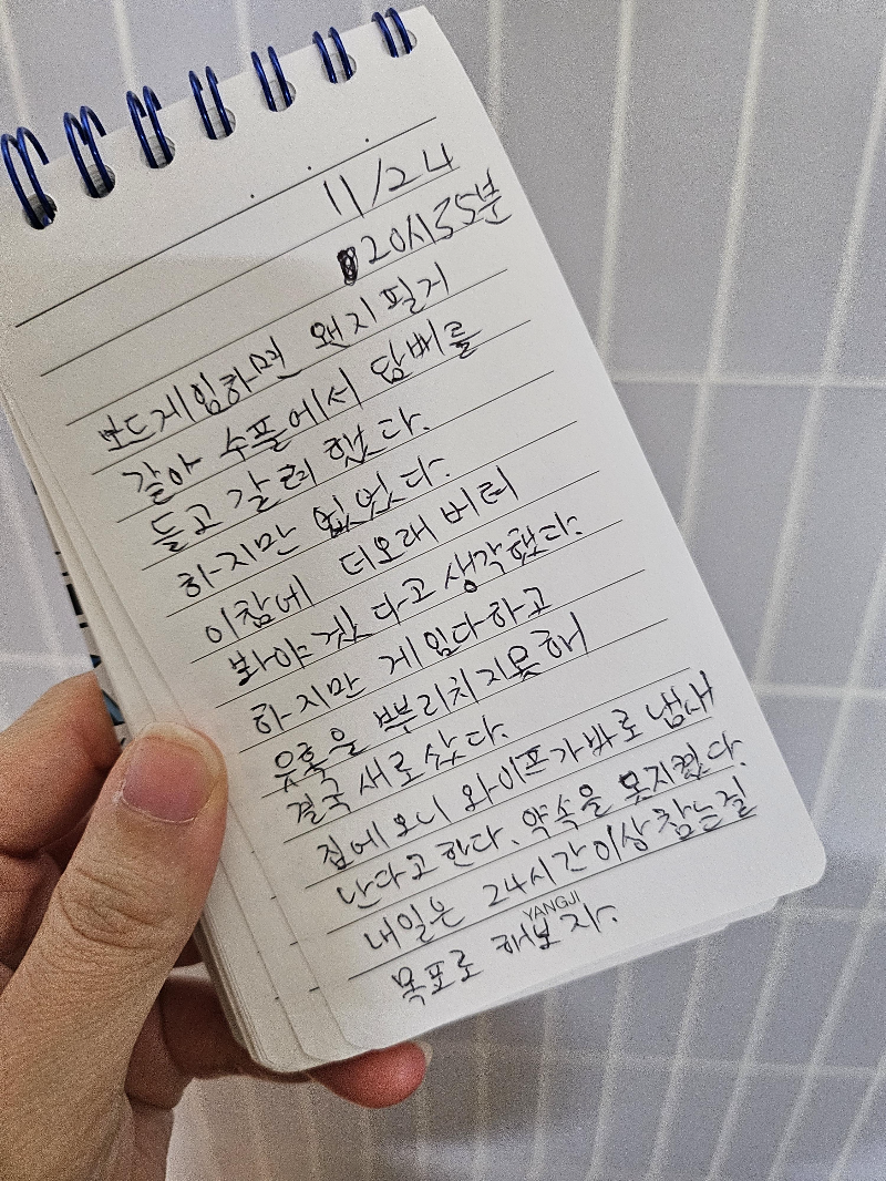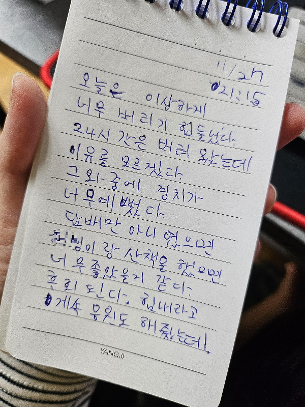 남편의 처절한 금연 일지입니다. 도저히 참을 수 없을 때 피고 와서 느낀점을 적고 있습니다. 이를 통해서 자신과의 다짐, 소중한 사람들에 대한 인식을 하게 되어 더 금연 확률을 높일 수 있습니다.