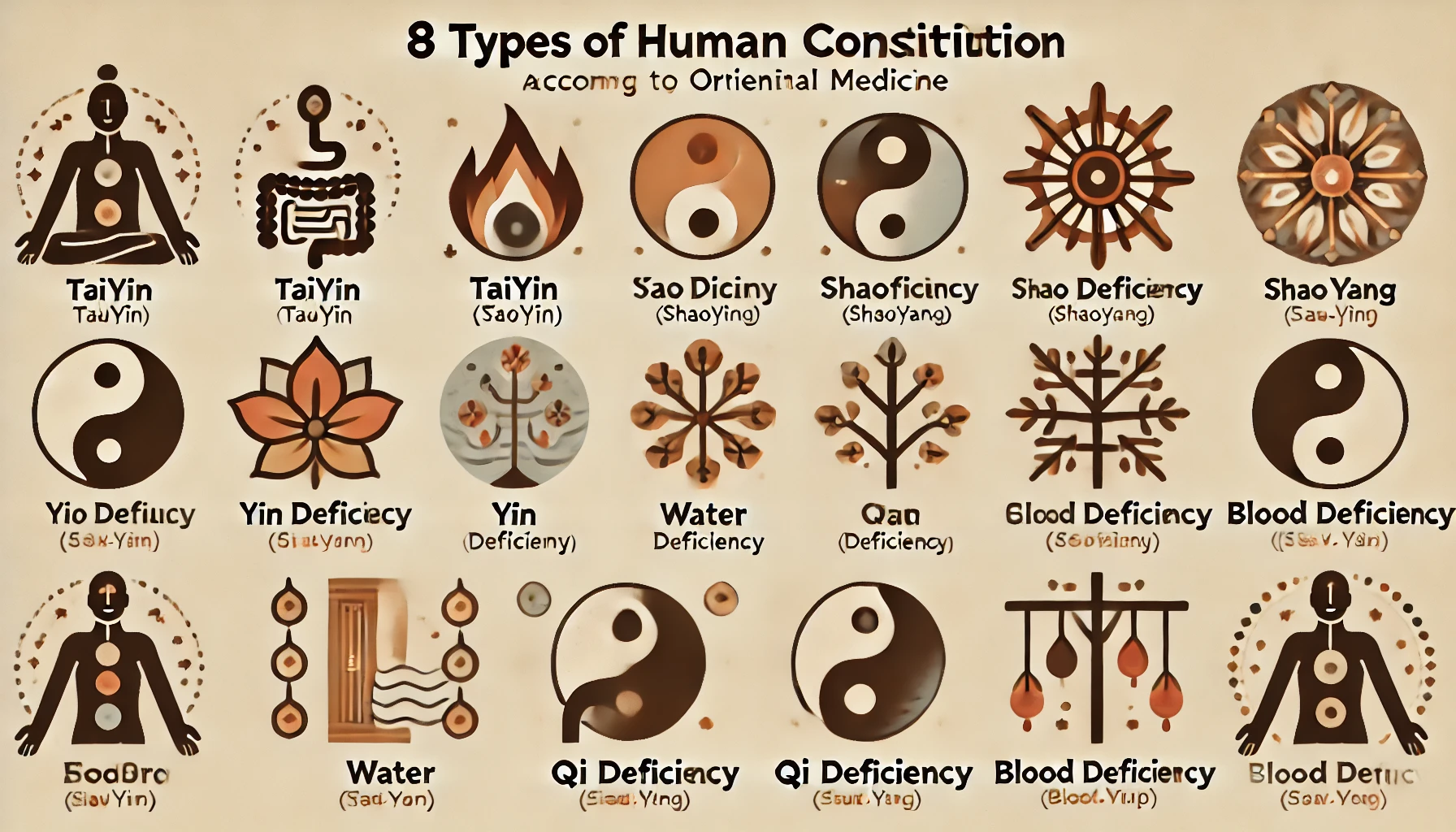 한의학에서의 체질은 각 개인의 고유한 활력(에너지)에서 시작합니다. 신체 기관의 기능과 에너지 흐름 및 민감성을 가지고 측정하며, 이 측정된 데이터는 몸의 형상에 표현됩니다. 8가지의 유형을 분류하면 다음과 같습니다.