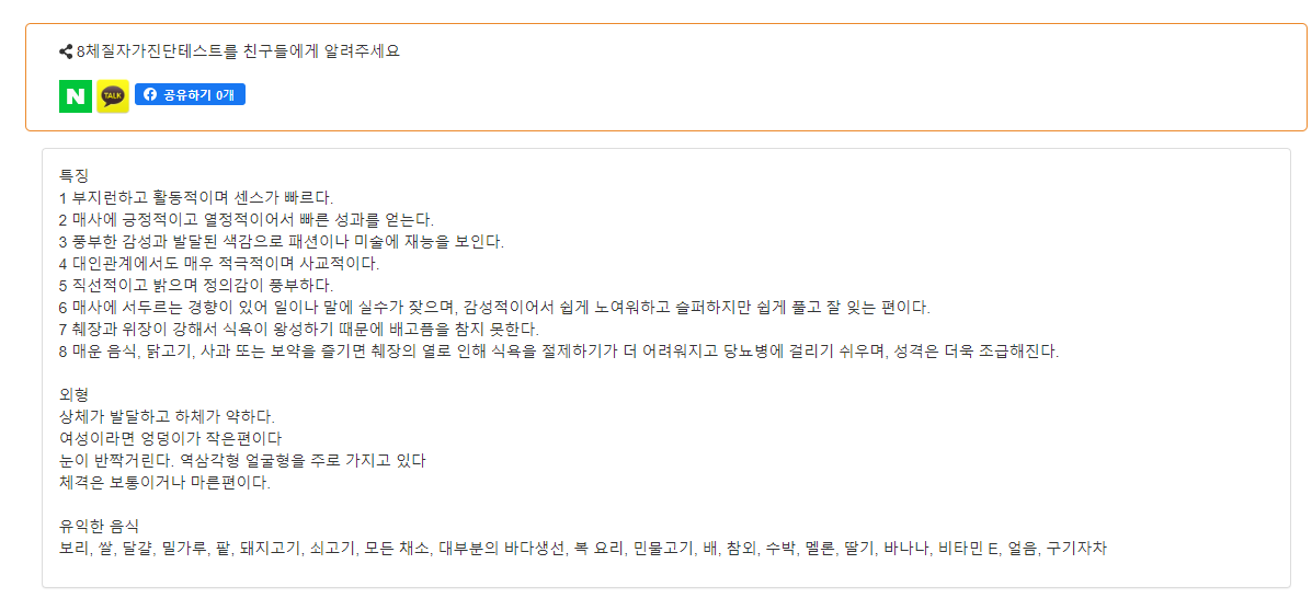 토양의 기운이 많이 나온 것을 확인할 수 있습니다. 이러한 유형은 부지런하고 활동적이며 센스가 있고, 에너지가 넘치며, 사교적이라고 합니다. 그리고 닭고기가 체질상 맞지 않으니 주의가 필요합니다.
