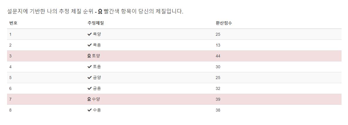 | 3 | 태양 유형 - 물의 요소 | 활력이 넘치고 외향적인 유형으로 비뇨기 계통과 관련된 문제로 고통받을 경향이 있으므로 주의가 필요합니다. 이러한 유형은 오이나 멜론과 같은 찬 음식을 드시는 것이 좋습니다. |