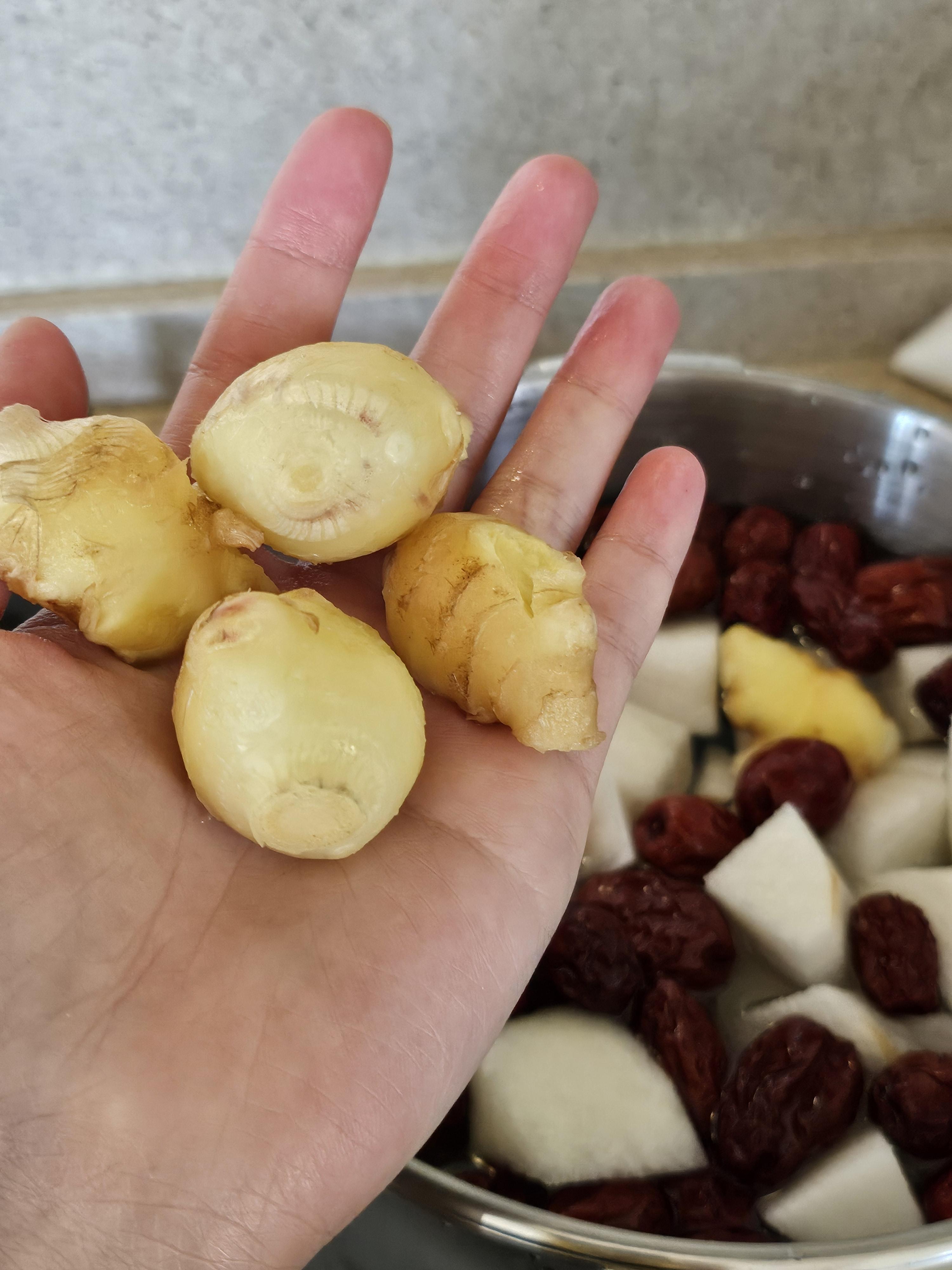 재료 준비 및 손질: 물 1800ml 에 대추 20알, 생강 4개, 배 1개, 꿀 혹은 설탕 취향껏 준비합니다. 대추는 깨끗하게 씻어 불순물을 제거해 주세요. 생강은 숟가락으로 긁어 껍질을 제거하고, 배 또한 껍질을 벗겨 깍뚝 썰기하세요.