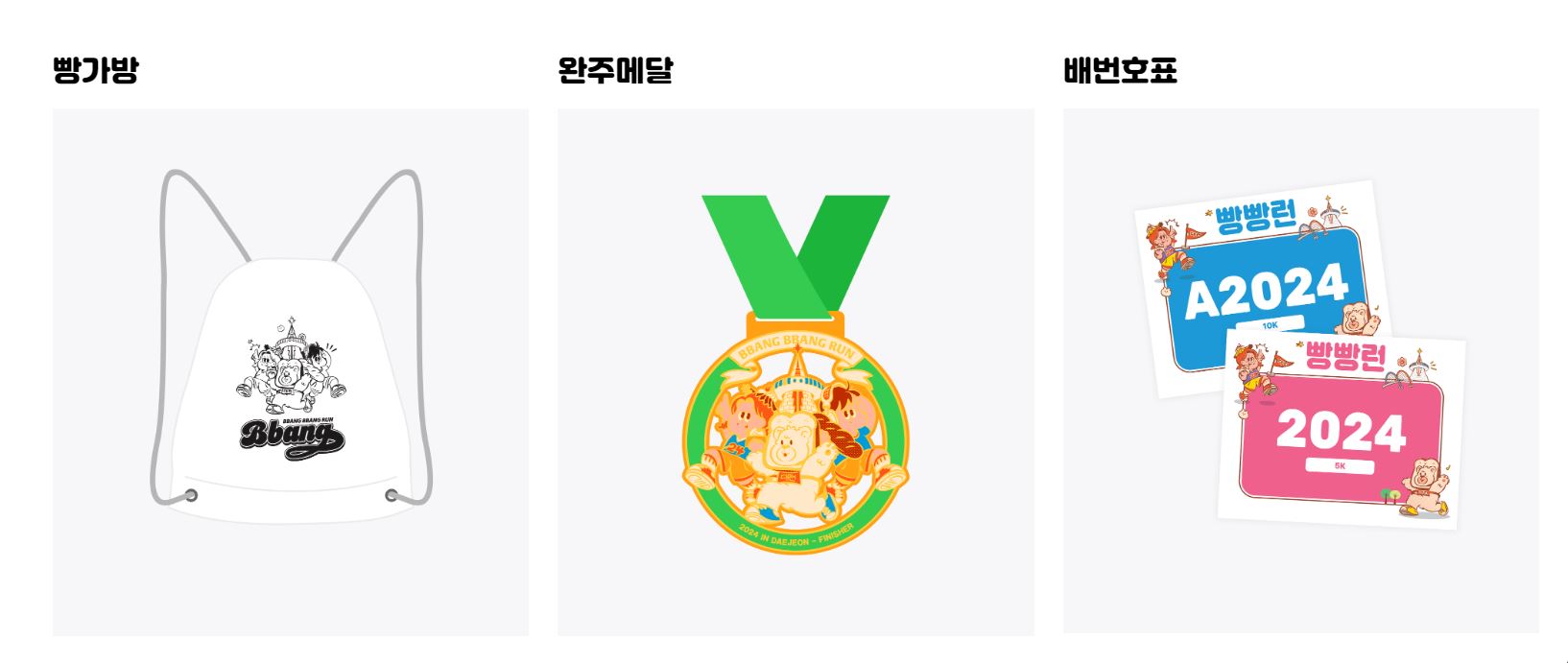 대회에 참여하는 모든 분들에게는 귀여운 참가자 티셔츠를 받으실 수 있습니다. 사이즈도 S~ 2XL 까지 다양하게 준비되어 있어서 선택의 폭이 넓은 편입니다. 그리고 빵가방과 완주시 주는 메달, 귀여운 배번호표, 대전의 빵지도와 아까 말씀드렸던 성심당에서 만든 빵을 받으실 수 있습니다. 튀김 소보로를 주더라구요.
