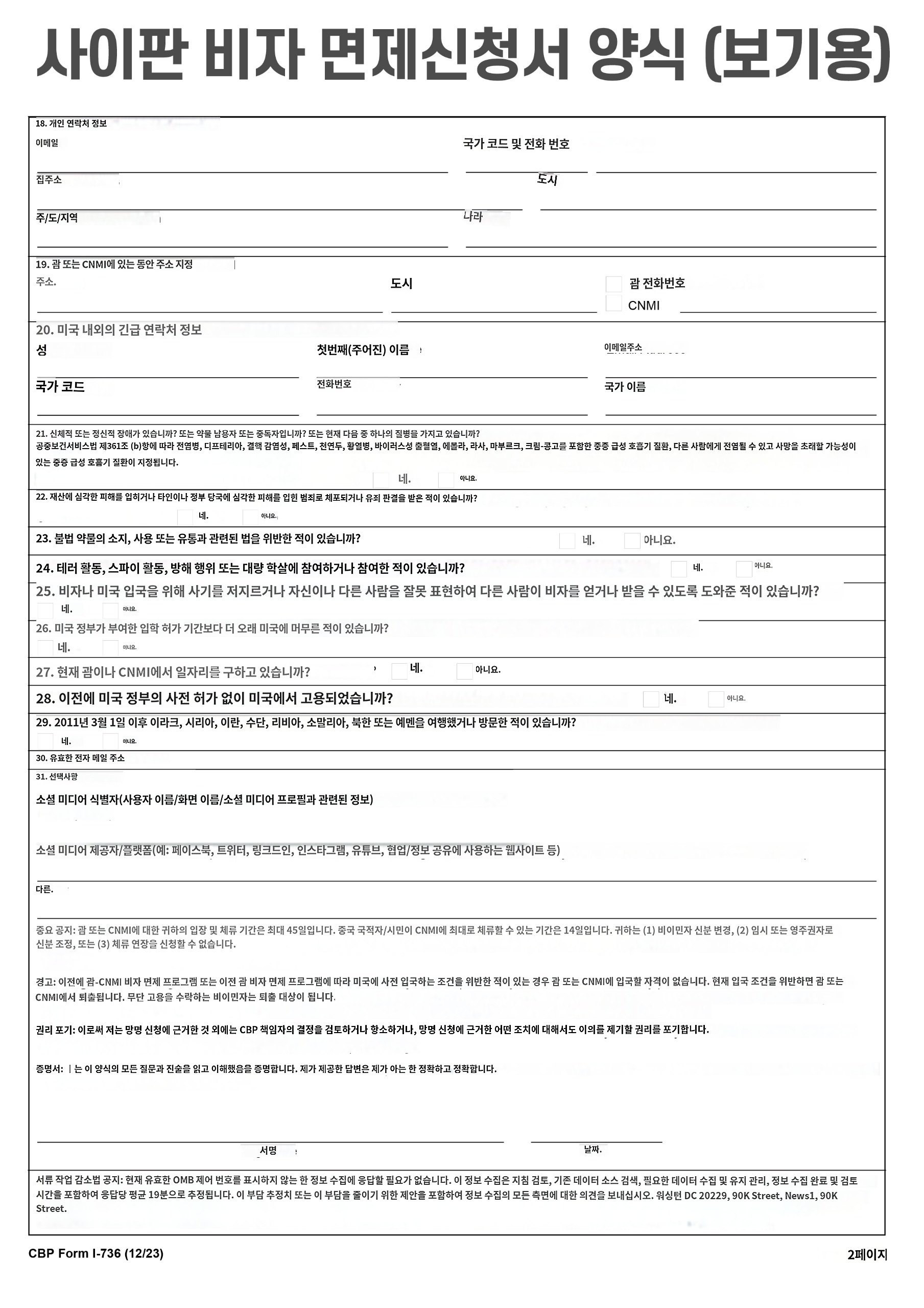 2. 사이판 비자 면제 신청서 작성 요령