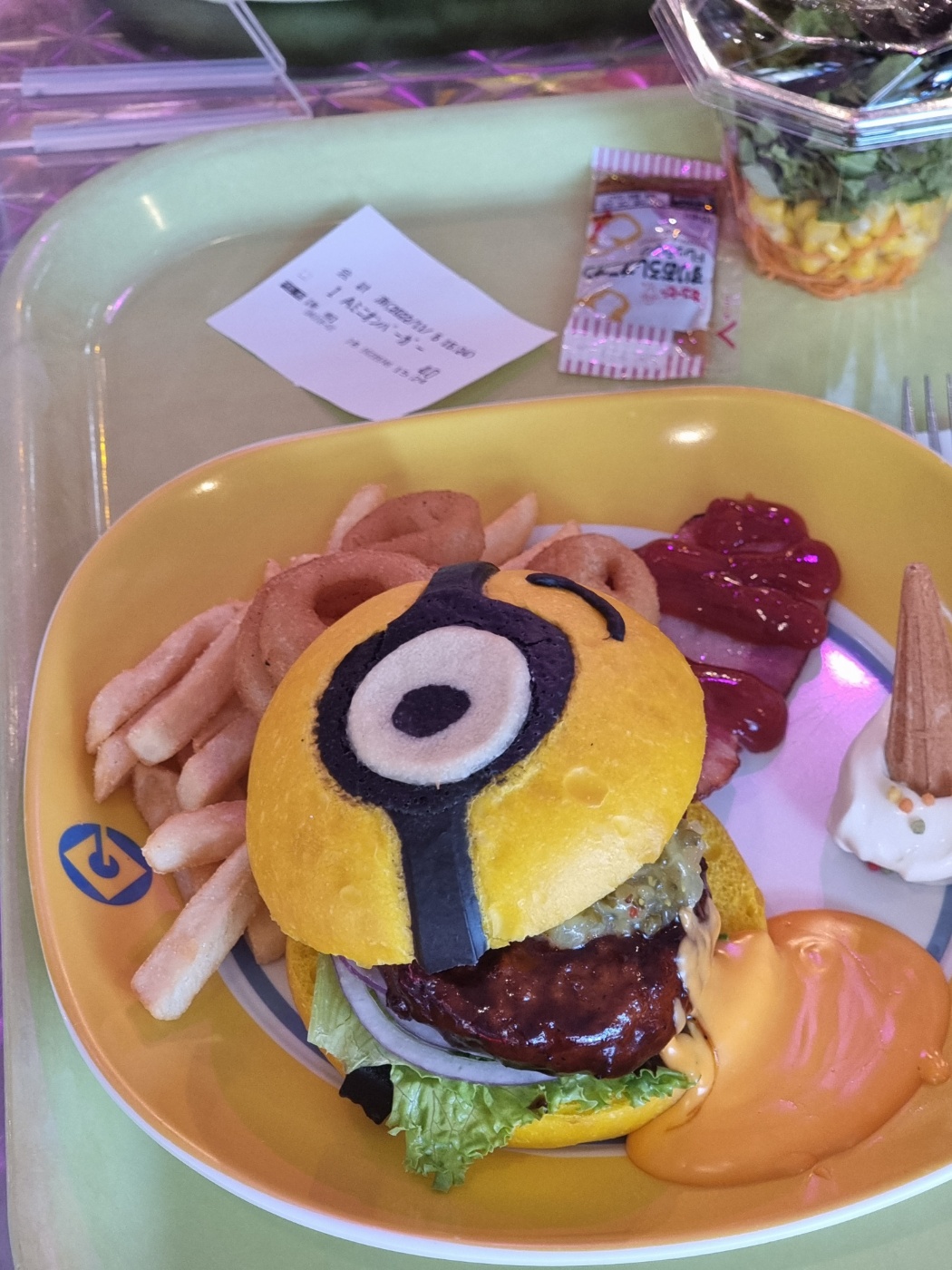 2. 음식 추천: 해리포터 팬이라면 먹어봐야 하는 음료인 버터맥주는 신기한 경험을 하게 만듭니다. 저희는 미니언즈 마을에서 미니언 모양의 버거를 먹었습니다.