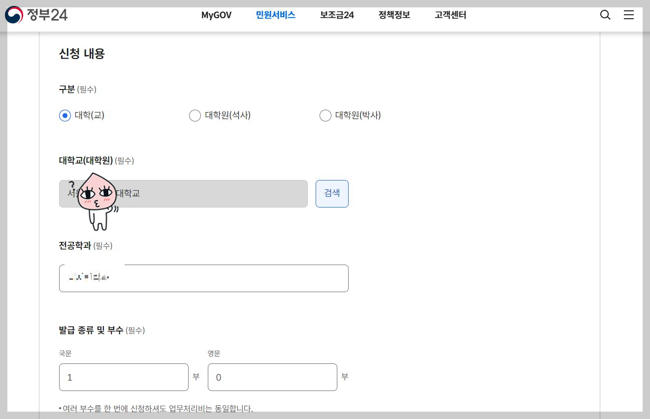 - 대학교(대학원) 을 [검색]하여 자신의 대학교를 지정해줍니다. 그리고 전공한 학과와 발급 부수를 설정해줍니다.