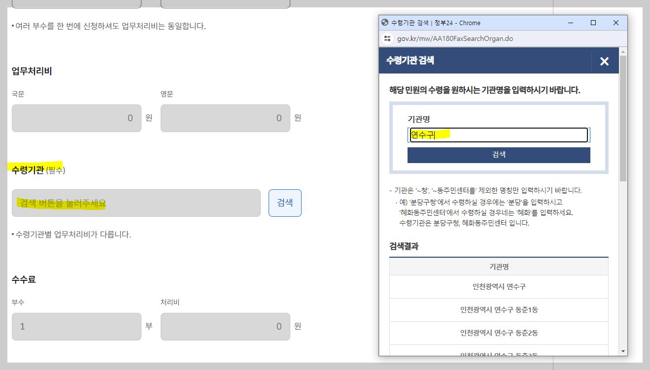 그리고 기관일 경우 '~청', '~ 동 주민센터'를 제외한 명칭만 입력하시길 바랍니다. 예를 들면 '송도구청' 에서 수령하길 원하실 경우 '송도'를 입력하시면 됩니다.
