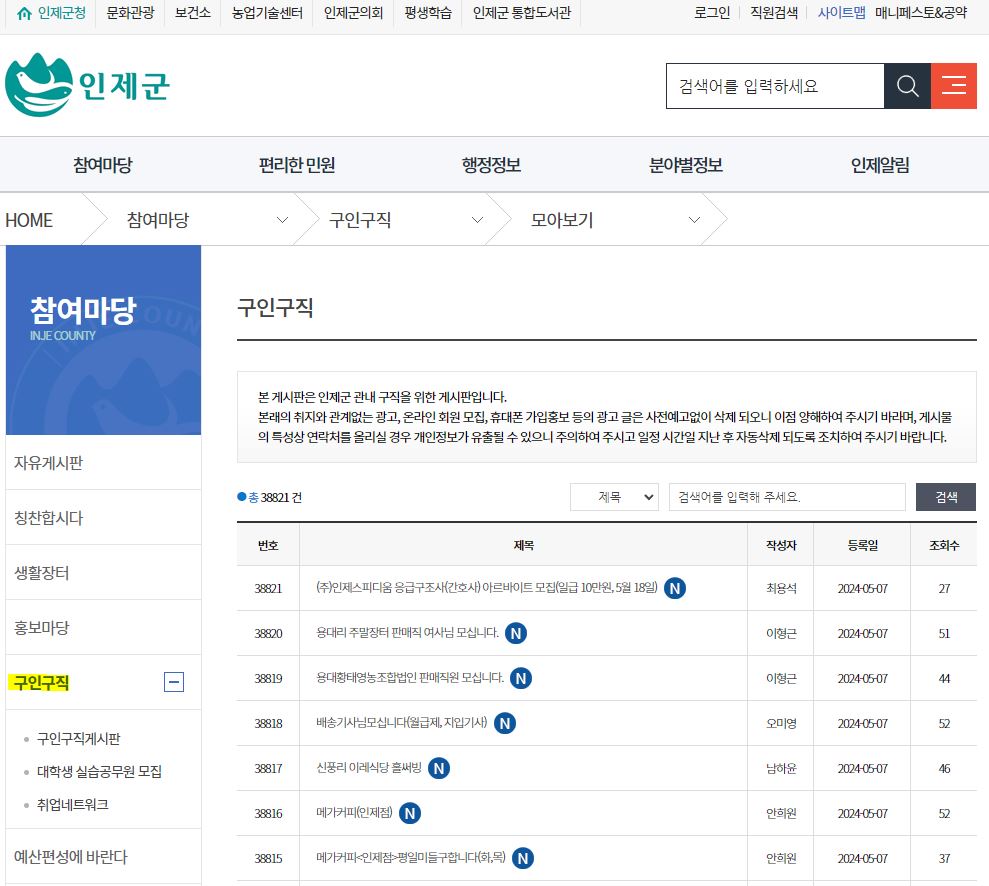 각자 계신 지역의 군청과 시청에서 운영하는 사이트에서 찾아보실 수 있습니다. [00시청 구인 구직]을 검색을 통해서도 접속할 수 있지만 지자체 홈페이지에 접속 후 > 참여마당 > 구인구직에 들어가셔도 확인하실 수 있습니다.