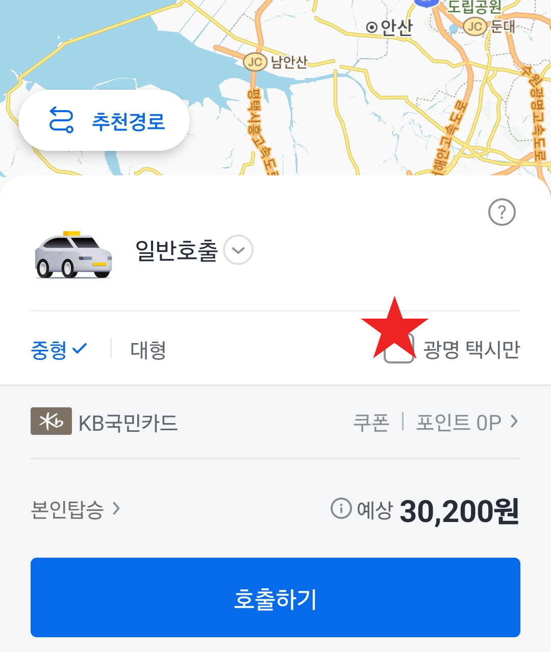 여기서 추가적인 팁을 알려드리자면, 제가 있는 곳이 인천인데 가고자 하는 지역은 타 시라면 시외할증이 붙어서 요금을 더 내야 하는 경우가 생깁니다. 그럴 땐 요청하기 전에 [광명택시만]을 설정해주세요. 그러면 그 지역의 택시가 잡혀서 훨씬 저렴한 금액으로 이용할 수 있습니다.