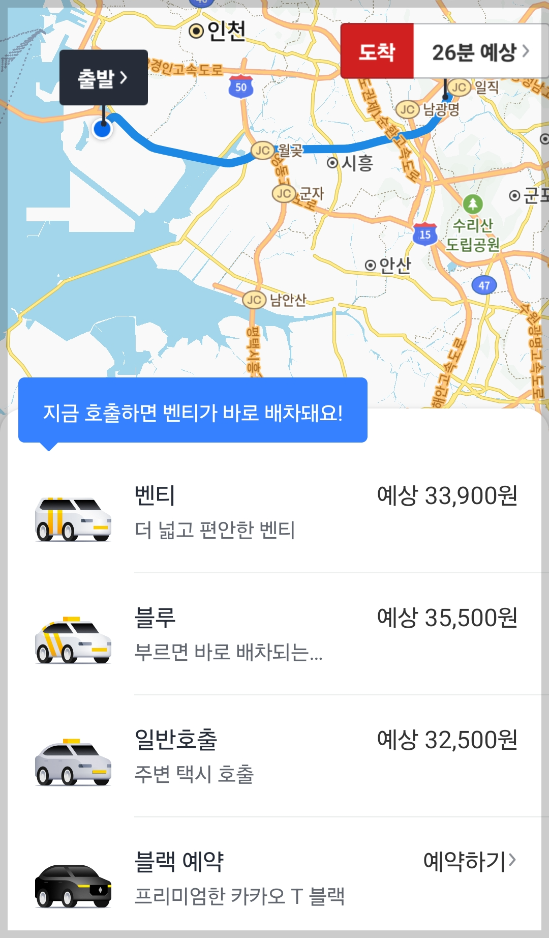 3. 서비스 유형 선택 : 카카오 택시에는 다양한 유형이 있습니다. 카카오에서 직접 운영하는 카카오 블루와 고급 택시인 카카오 블랙 택시 그리고 일반 택시나 벤택시를 이용할 수 있습니다. 일단 택시를 이용해도 카카오 블루 택시가 올 때가 있는데요, 그렇게 될 경우 비용을 더 지불하지 않아도 됩니다.