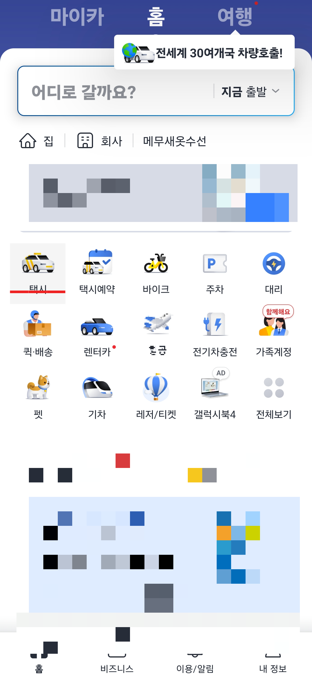 앱에 접속하시면 나의 위치를 켜시고, 차량을 예약합니다. 홈 화면에 있는 택시를 클릭해주세요. 지금 당장 타실 것이 아니라면 택시 예약을 클릭해 주시면 됩니다.