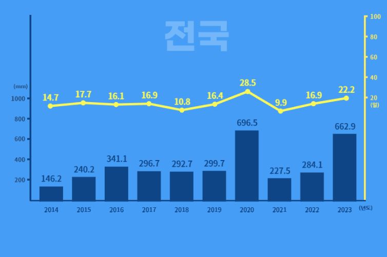 그리고 최근 10년간 장마기간의 강수량과 강수 일수를 살펴보면, 올해 어느정도 올지 예측이 가능할 것 같습니다.
