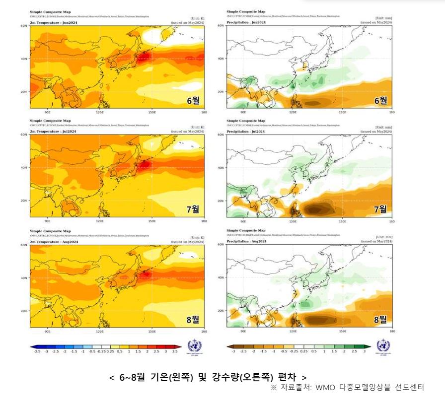 2024년 5월 23일에 발표된 기상청 날씨누리 3개월 전망 자료를 살펴보시면 다양한 기상정보를 얻을 수 있는데요. 그중에서도 기후 예측모델 분석을 살펴보시면 6~8월 모두 평년보다 기온이 높을 확률이 크다고 합니다. 무려 91%~ 94% 확률로요. 그리고 강수량은 6월에서 7월이 평년보다 많을 확률이 크다고 합니다. (46~49%) 올해도 많이 덥고 습하겠네요. 점점 동남아가 되어가는 느낌입니다.