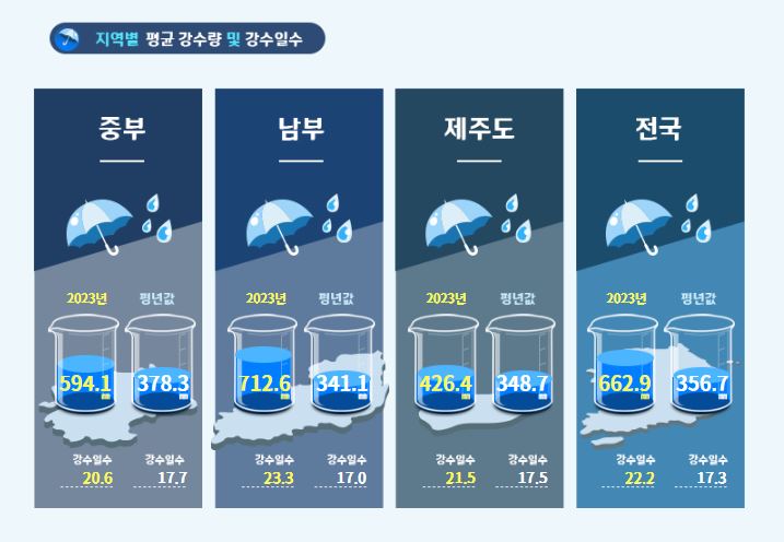 그리고 작년에는 마치 소나기 처럼 쏟아부었던 기억이 납니다. 제 기억엔 마치 동남아처럼 자고 있을 때 비가 엄청 많이 왔던거 같아요. 정확한 데이터를 살펴보시면 남부지방은 평년값보다 두 배나 되는 비가 내렸고, 강수일수도 5일 정도 더 많았네요. 제주도는 평년값과 비슷했으며, 중부지방도 꽤 많은 비가 내린 것을 알 수 있습니다.